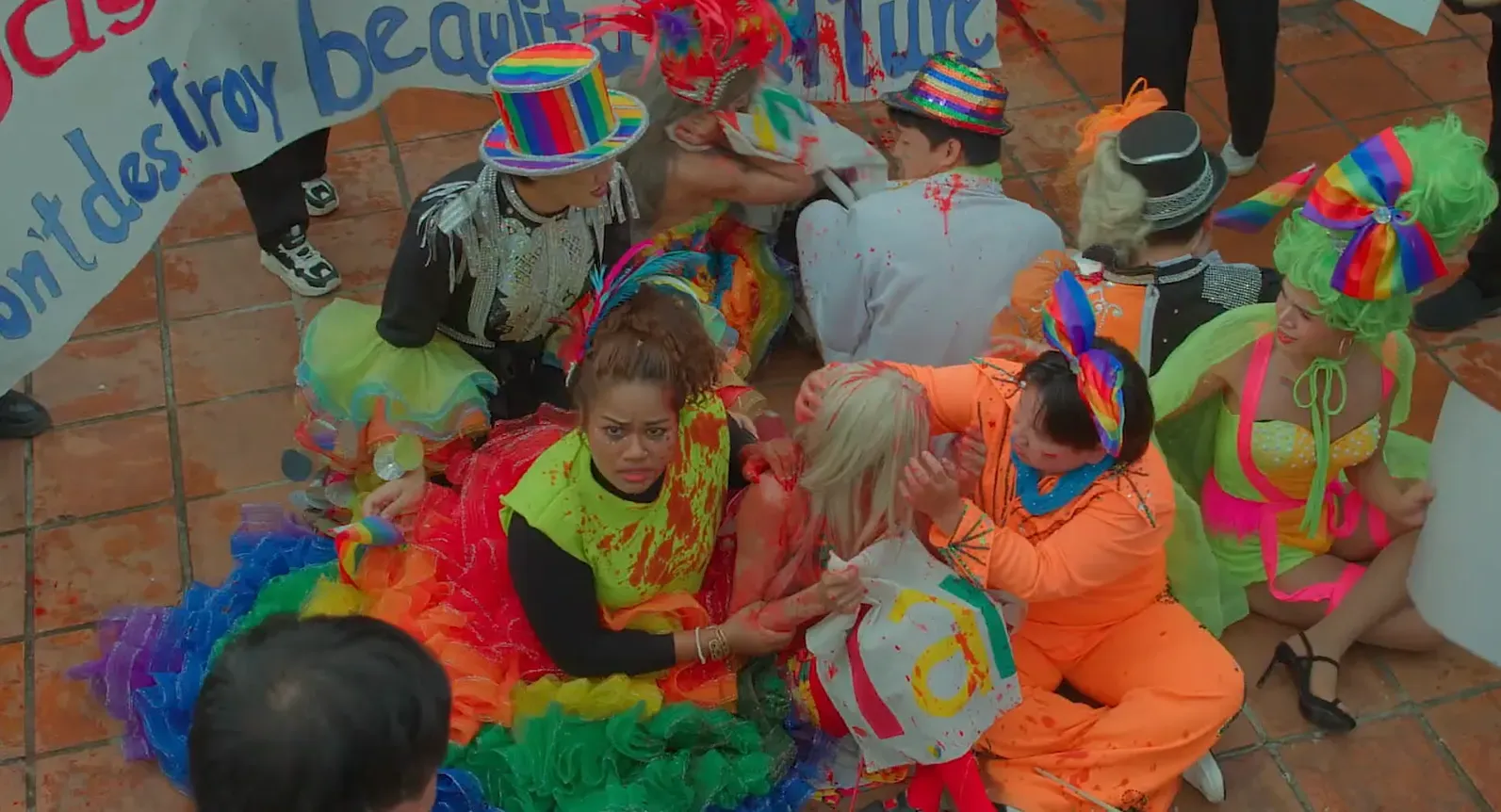 หนึ่งในฉากสำคัญของเรื่อง คือการจำลองเหตุการณ์ ‘เสาร์ซาวเอ็ด’ (เหตุการณ์ความรุนแรงในงาน Pride เชียงใหม่ ปี 2552) บาดแผลทางประวัติศาสตร์ที่คนรุ่นใหม่อาจไม่เคยรู้